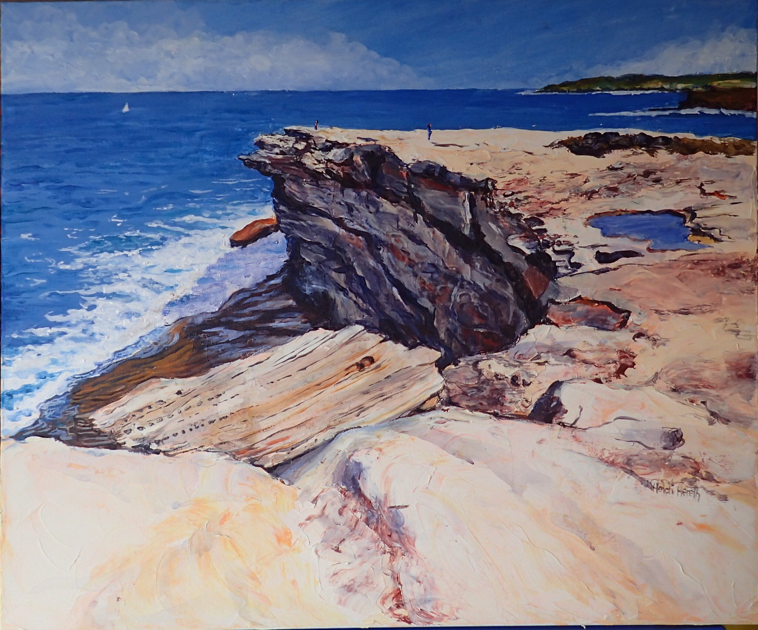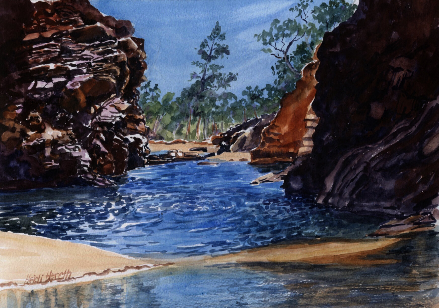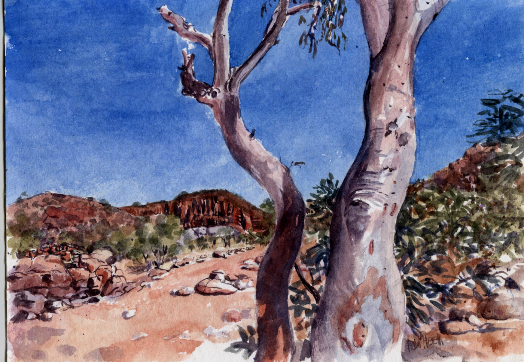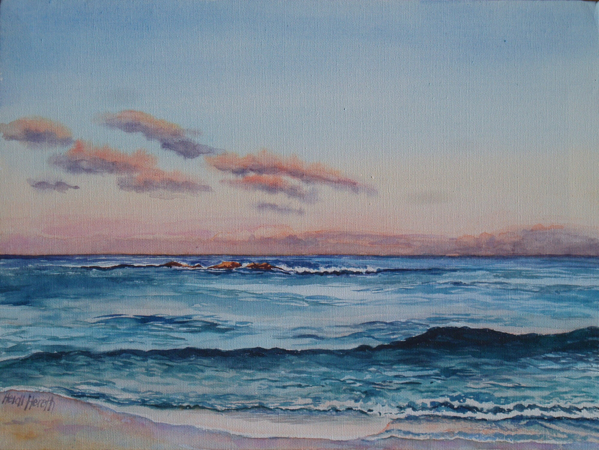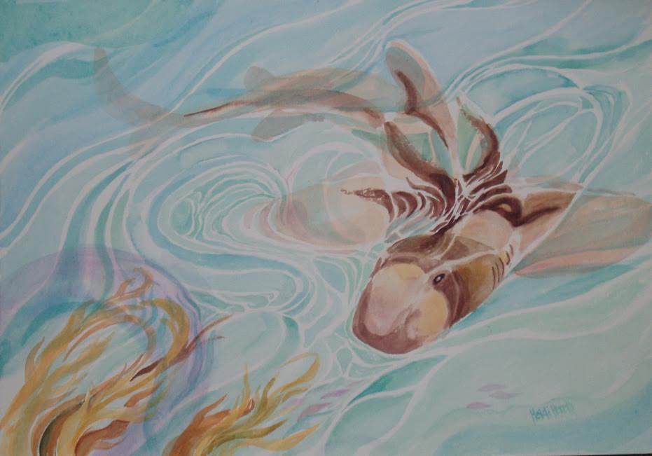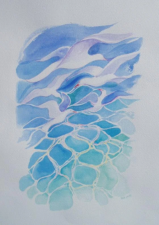 Heidi paints in watercolours and acrylics. She loves to paint natural landscapes, particularly the sea, both above and below the surface. Her painting practice is supplemented with watercolour sketches of figures sunbaking on the beach and coloured pencil sketches of musicians at concerts. She rarely leaves home without a sketchbook.